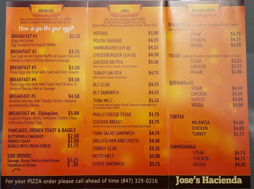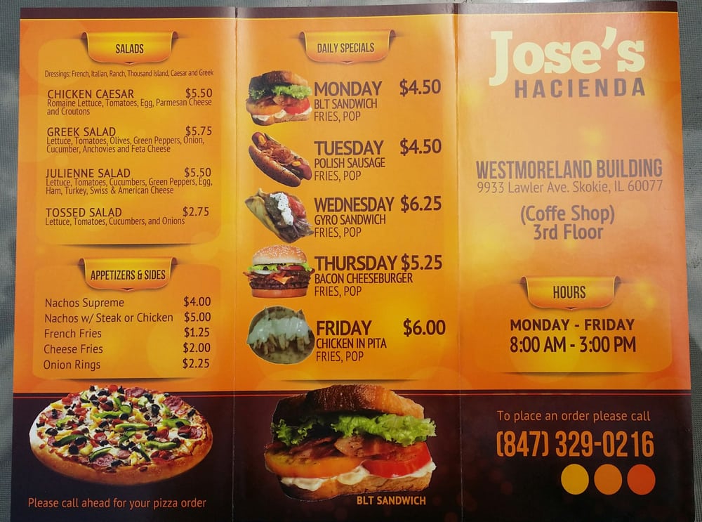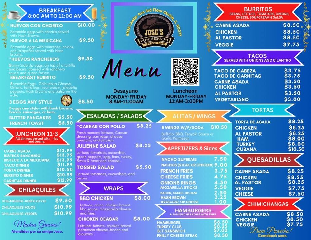 Welcome to Jose's Hacienda, a charming hidden gem located on the 3rd floor of an office building at 9933 Lawler Ave, Skokie, IL. Here, Mexican cuisine comes alive with authenticity and warmth. The menu features delightfully crafted options ranging from breakfast burritos bursting with flavor to savory quesadillas, all made from scratch by the friendly owner, Jose.